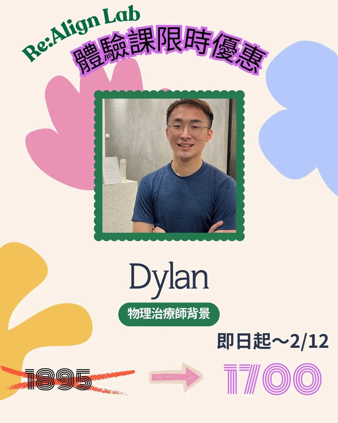 即日起~2/12 Dylan老師的體驗課優惠價1700,歡迎多加利用!每週三、週四可預約!